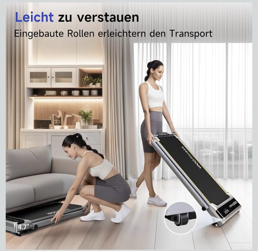 【Prijenosna traka za trčanje i ušteda prostora】 Dizajn bez instalacije, “uključi i koristi”. Dimenzije: 116 x 62,5 x 13,5 cm. Težina: 19,3 kg. Traka za trčanje je lagana i ima dva prednja kotača za lakše kretanje. Možete je postaviti u podnožje kreveta ili ispod sofe radi uštede prostora. Jedinstveni dizajn otvora za podmazivanje olakšava održavanje.
