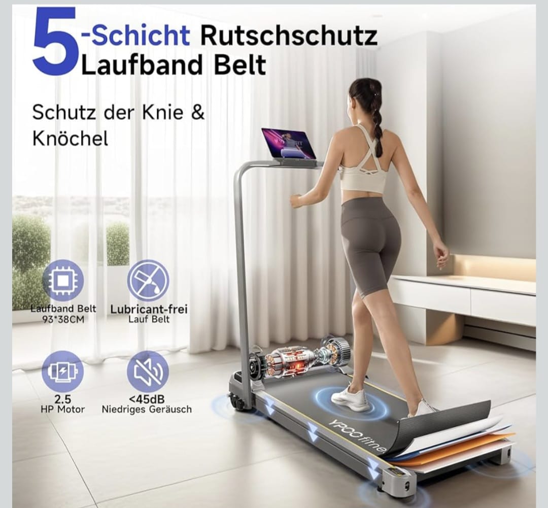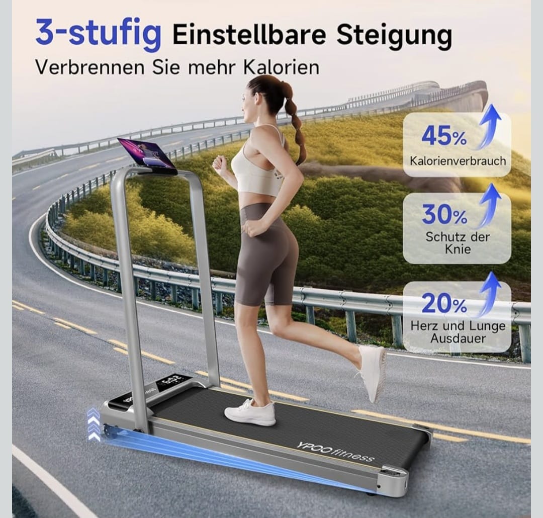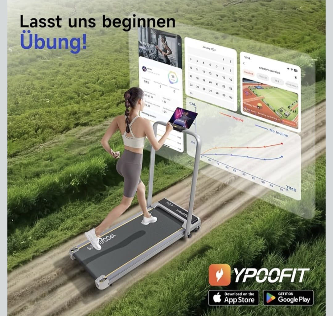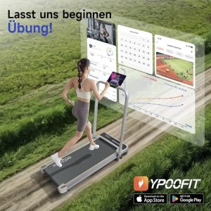 YPOO Sklopiva traka za trčanje s aplikacijom: spojite Ypoofit aplikaciju na našu traku za trčanje s nagibom za interaktivni trening. Koristite držač za telefon na prijenosnoj traci za trčanje za gledanje videa i daljinski upravljač za jednostavno podešavanje brzine. YPOOFIT prati vaš napredak i povezuje vas s drugim korisnicima. Zbog toga je ova traka za trčanje s nagibom savršena za vaš fitness trening kod kuće.